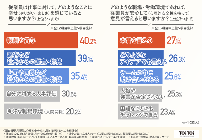 2022年7月にサービス業・製造業の会社員(役職なし)を対象に実施した「企業の1on1と職場の心理的安全性」に関する調査(https://prtimes.jp/main/html/rd/p/000000008.000085990.html)では、会社員の半数が報酬や賞与といった仕事で得られる対価に対して幸せを感じる一方、残りの半数は社内外からの謝意・称賛や良好な職場環境といったいわゆる心理的安全性の高い職場で起き得ること、得られるものに関して幸せを感じることが明らかになっていますが、従業員のそういった思いを経営者も理解しているといえそうです。