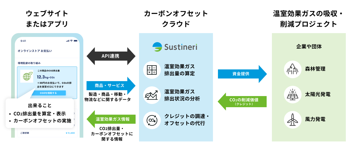 Sustineriは、「人と地球が共存する新たなあり方を創造する」をミッションに、一部の大企業だけでなく、多くの企業と個人が手軽に効果的な気候変動対策を実施できるウェブサービスを開発しているClimate Tech 企業です。API連携などにより、Web上で販売する商品やサービスのCO2排出量を自動算定・相殺する「カーボンオフセットクラウド」などを提供しています。
