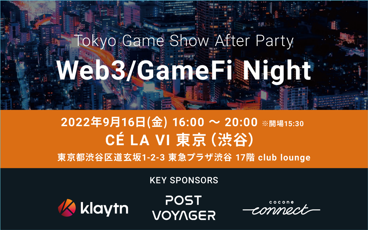東京ゲームショウ2022にあわせカカオのBlockchain「Klaytn」とココネグループにてWeb3/GameFi関係者向けアフターパーティーを開催します。