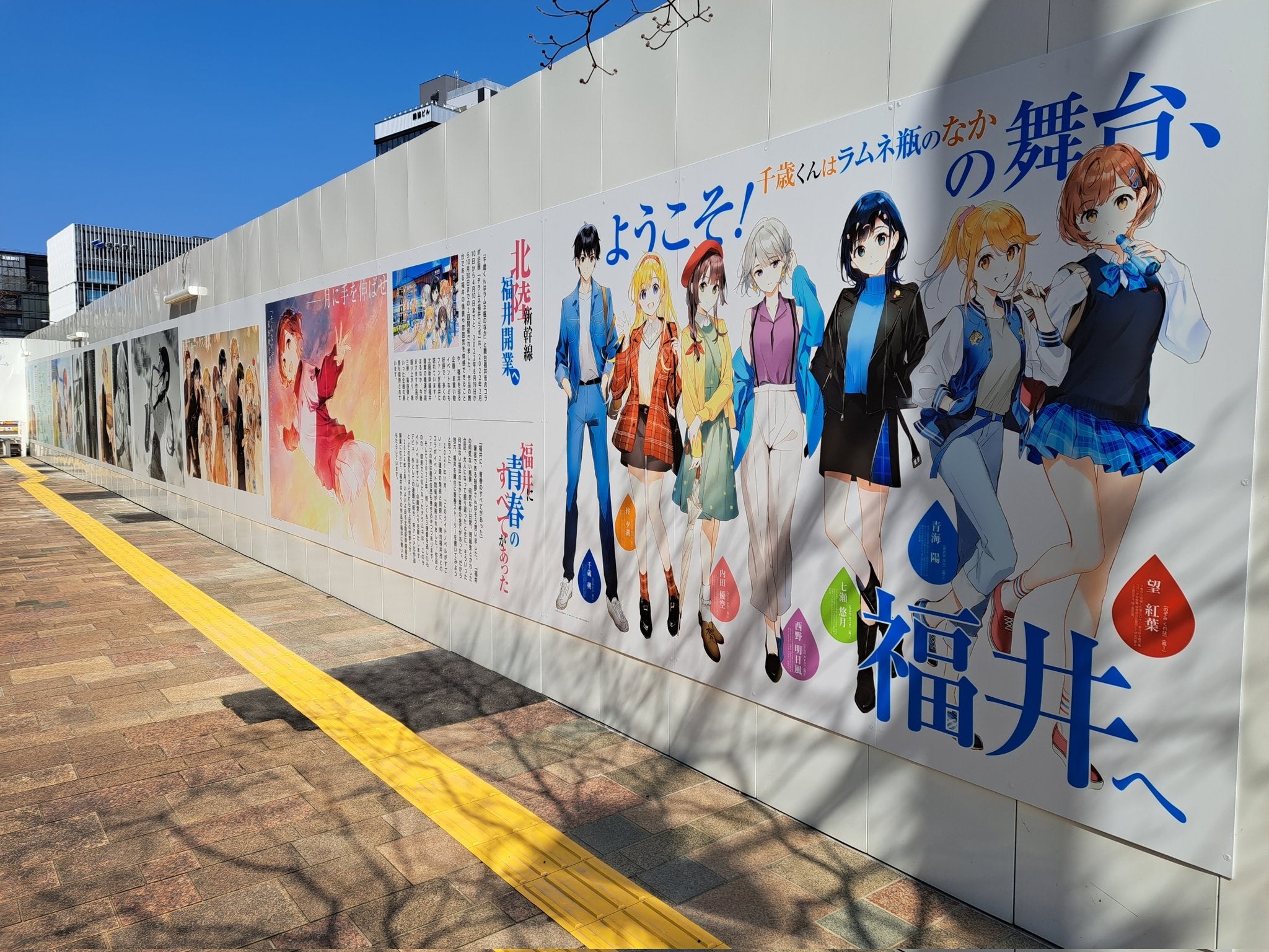 ・福井駅西口電車通りの工事仮囲いにて、作品を紹介するラッピングが行われています。