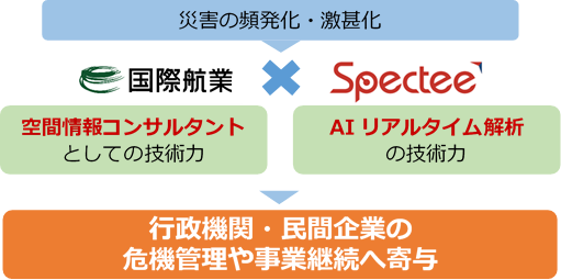 国際航業株式会社(代表取締役社長:土方 聡、以下「国際航業」)は人工知能(AI)を活用した情報解析ソリューションを提供する株式会社Spectee(代表取締役:村上 建治郎、以下「スペクティ」)と販売代理店契約を締結し、AIと空間情報技術を活用した防災・減災ソリューションの創出に共同で取り組むことに合意しました。