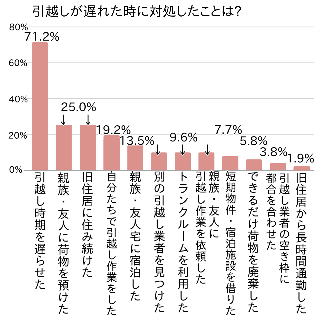 もちろん、うまくいかず、引越し待ち期間の家がない状態になる人も多数いました。その場合多かったのは「親族・友人に荷物を預けた(25.0%)」「親族・友人宅に宿泊した(13.5%)」パターンで、長期になると「短期物件・宿泊施設を借りた(7.7%)」ケースも多く見受けられました。