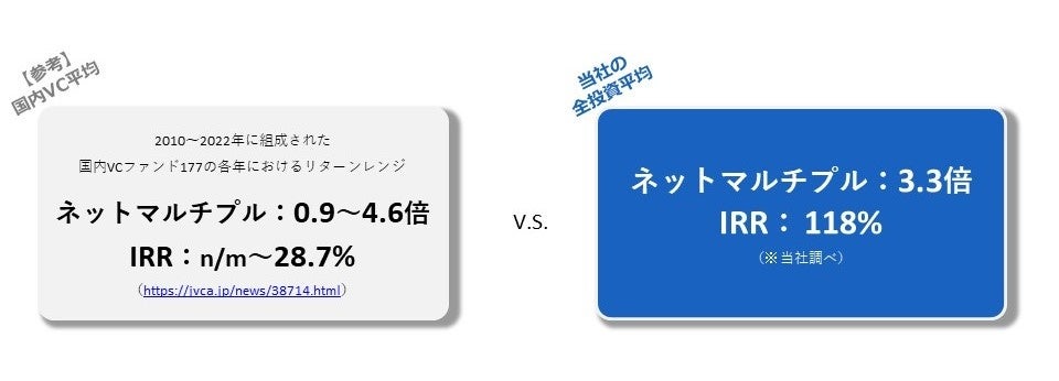 今般の譲渡で、当社グループの自己投資の平均リターンは高水準なものになっていますが、ご参考で、2010~2022年にかけて組成された国内VC(177ファンド)におけるリターン・レンジも見てみますと、組成された時期によって幅は広いものの、概ねネットマルチプルは大半の年で2倍を下回っている模様です。