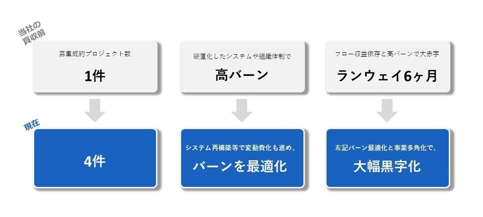 当社は、2021年9月にインターネット金融大手のSBIグループより、当社の前身であるSBIエクイティクラウド株式会社の株式100%を買収し、株式型クラウドファンディング事業に参入いたしました。その後、経営陣を現メンバーに刷新し、抜本的な事業構造の見直しから新規事業の展開等、PMI(Post-Merger-Integration)とグロース戦略を両建てでスピーディーに推進してきたため、大幅なバリューアップを実現できました。