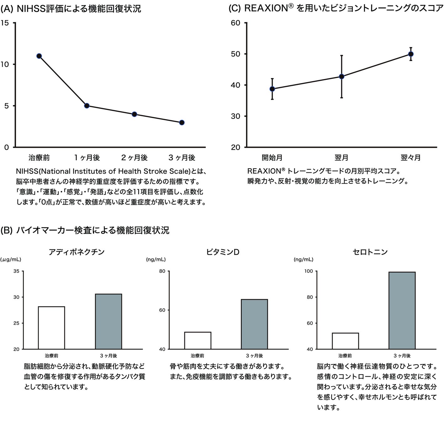 また、幹細胞培養上清液の使用に加え、日々のリハビリテーション、特に「REAXION」を活用しビジョントレーニングによる前頭前野の活性化が、今回の驚異的な改善効果に影響したと考えられます(図C)。