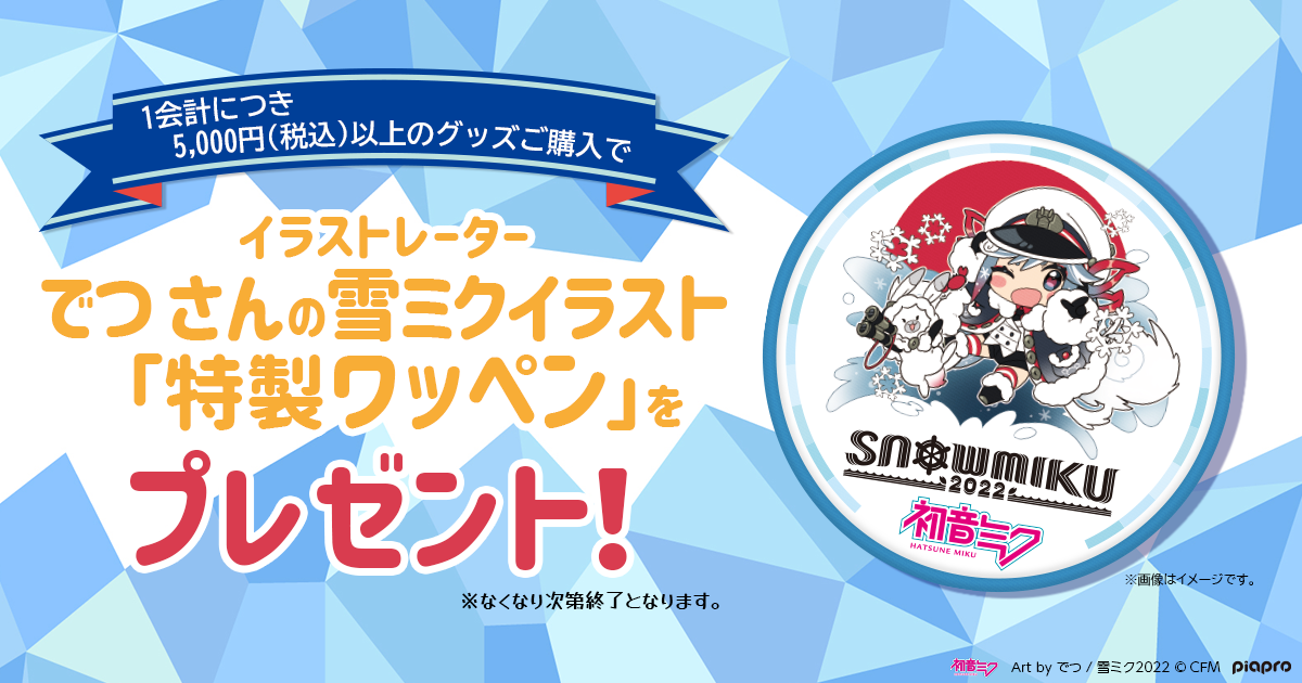 期間中、出展ブースにて1会計につき5,000円(税込)以上ご購入いただいた方には、イラストレーター でつ さん(https://twitter.com/hamudetsu)の雪ミクイラストを使用した直径10cmサイズの「特製ワッペン」をプレゼントいたします。