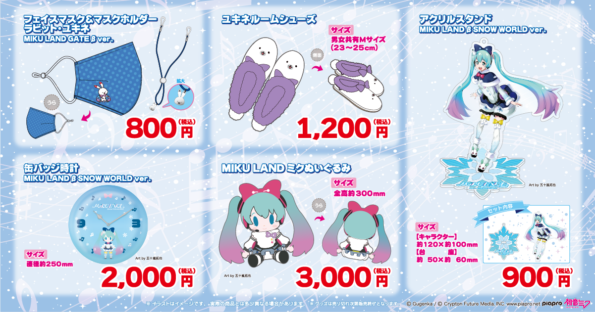 そのほか、「SNOW MIKU 2021」のTSUKUMOブースで販売していたVRワールド『MIKU LAND β SNOW WORLD』の初音ミクグッズを特別価格にて販売いたします。
