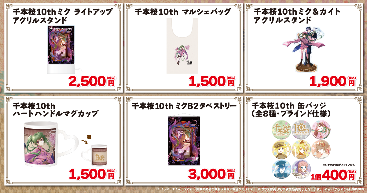 また『初音ミク「マジカルミライ 2021」』in TOKYOでも販売した、東京・秋葉原の「秋葉原和堂」の千本桜10周年グッズや、千本桜10周年記念イベント「千本桜の世界展」のアート展・「千本桜 10周年 fes」の千本桜グッズもご用意いたしました。