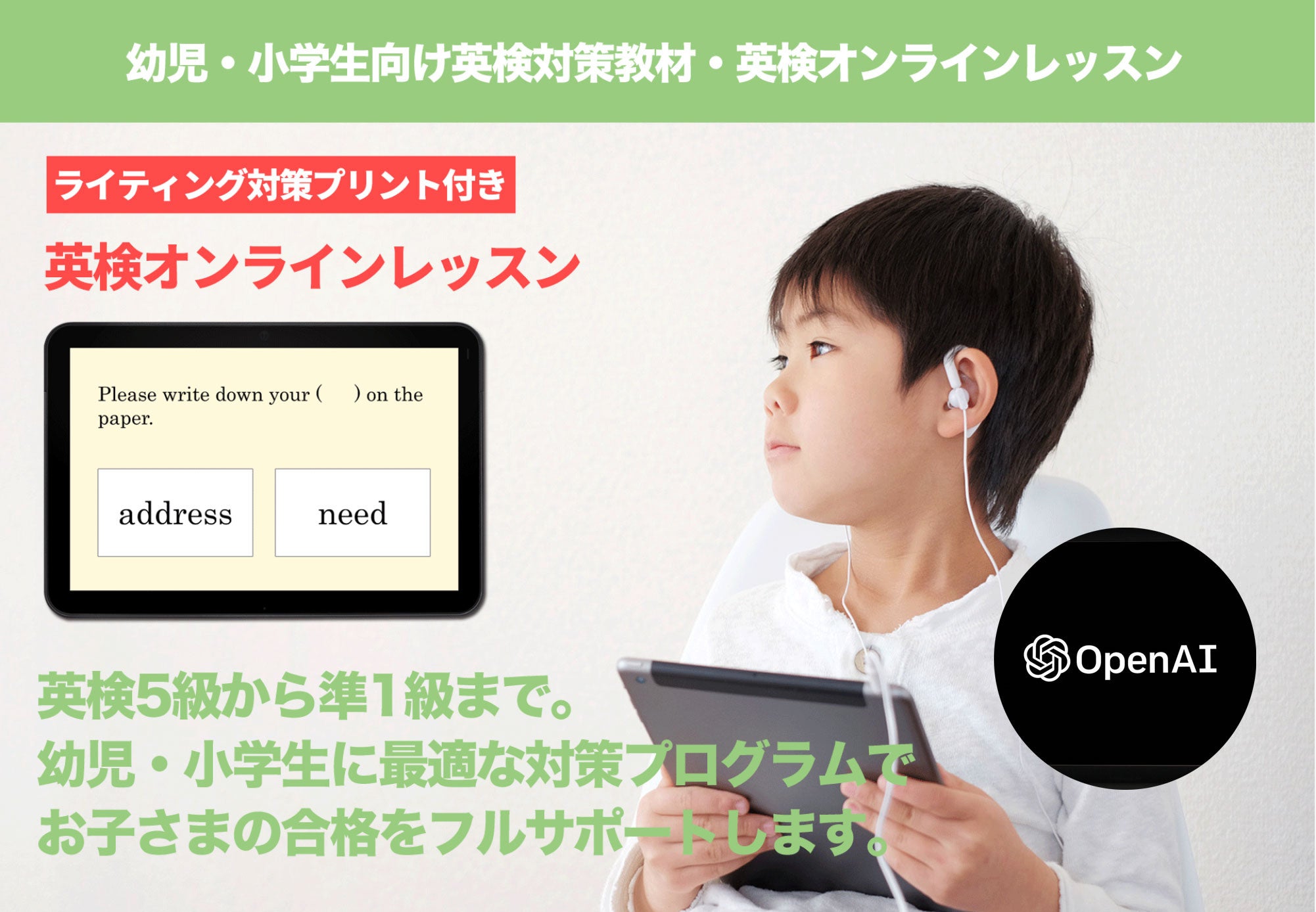株式会社児童英語研究所は現在、幼児・小学生でも取り組める英検対策教材『英検オンラインレッスン』(対象級は英検5級から準1級まで)を提供しているが、英検3級から準1級までの各級を対象に、AI を導入したライティングの指導が追加される。