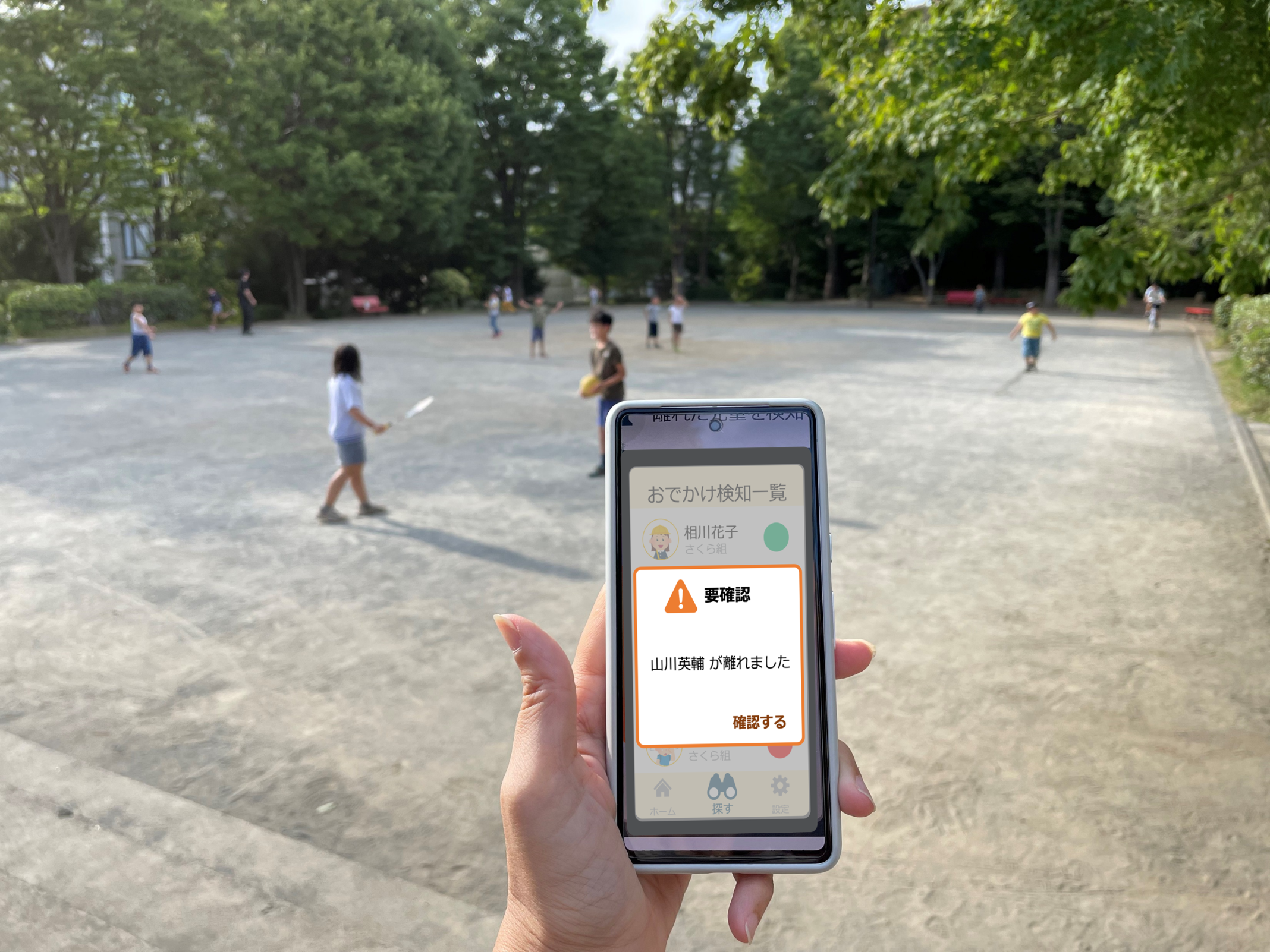 新たなオプション機能では、保育士が携行するスマートフォンに専用アプリをインストールしておくと、見守りタグを検知。保育士は事前に検知範囲の距離を指定することで、児童がその距離を超えて保育士のいる位置から離れた際に、自動的にスマホに警報音と通知を出します。通知には、離れた児童の名前もわかります。見落としを防ぐだけでなく、人数確認など点呼にかかる手間と時間を軽減します。