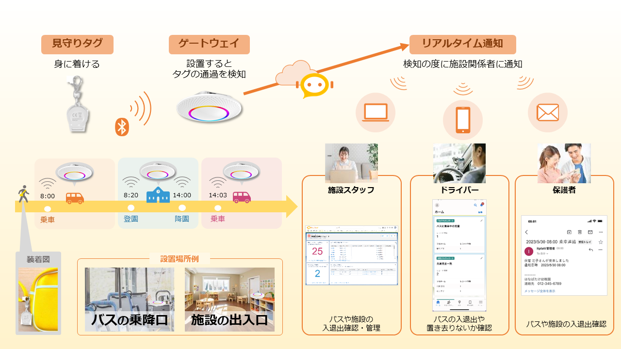 「きっずなび」は、直径約3cm・18gという小型の見守りタグ(Bluetoothを利用した小型の電波発信機)を身に着けるだけで、送迎バスの乗り降りや児童の施設への入退室をリアルタイムで検知、異常事態を早期発見し、置き去り事故を未然に防ぐサービスです。