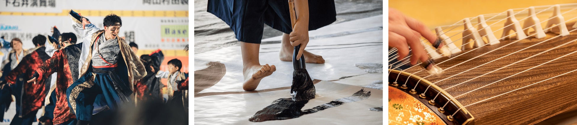 岡山を代表する「うらじゃ踊り」や、岡山県内の高校生による「和太鼓演奏」「書道パフォーマンス」「箏曲演奏」「備中神楽」などのステージパフォーマンス、「箏三重奏団 in Okayama」による日本の伝統楽器の箏・十七絃・三味線・胡弓によるアンサンブルの演奏など、様々なステージでイベントを盛り上げます!