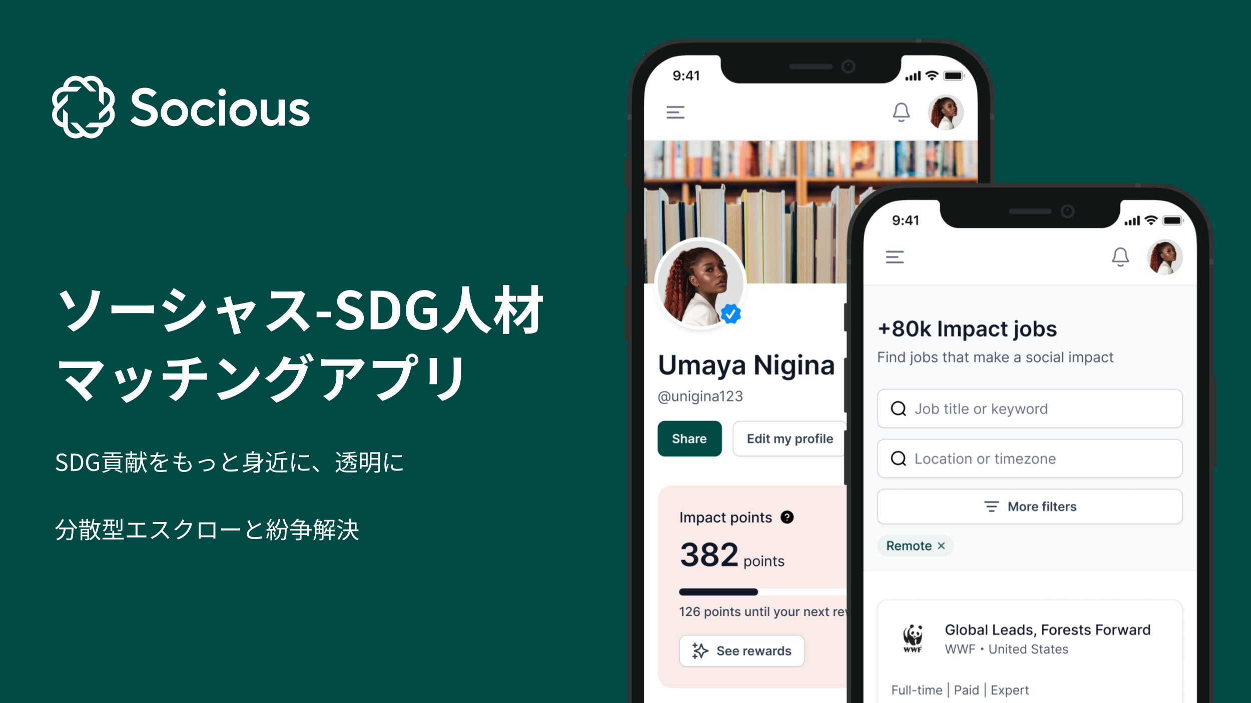 ソーシャスは、「世界を変える機会を全ての人に」というミッションのもと、SDG人材マッチングアプリを運営しています。世の中には社会貢献に興味はあるけれども行動に移せていない方がたくさんいます。ソーシャスは、そのような方々が気軽に楽しくSDGs達成に貢献できるように、SDGプロジェクト(NPO・ソーシャルビジネス・公共団体・企業のCSR部門等)とパーパス重視人材をAIでマッチングしています。また、ブロックチェーン技術を活用し、SDGアクションの透明性と信頼性を担保する「インパクトスコア」及びSDG貢献にインセンティブ付与するためのクリプトトークンを開発・運営しています。