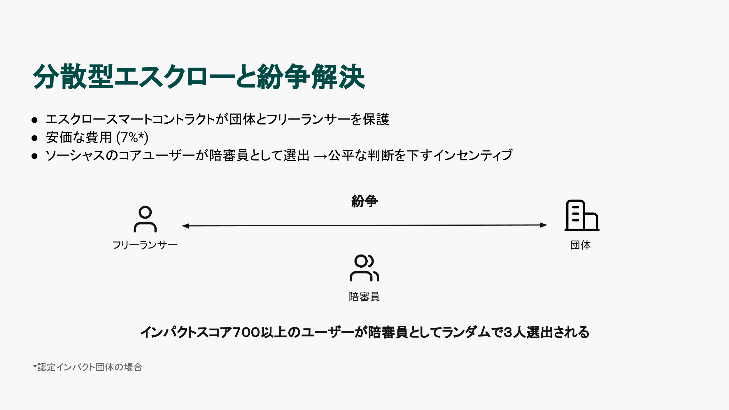 企業とフリーランサーの間で紛争が発生した場合、ソーシャスのコミュニティメンバーがランダムで3人の陪審員として選出され、中立的な立場で判断します。ソーシャスのコアユーザーのみが陪審員として選出されるため、公平な判断を下すインセンティブが働きます。