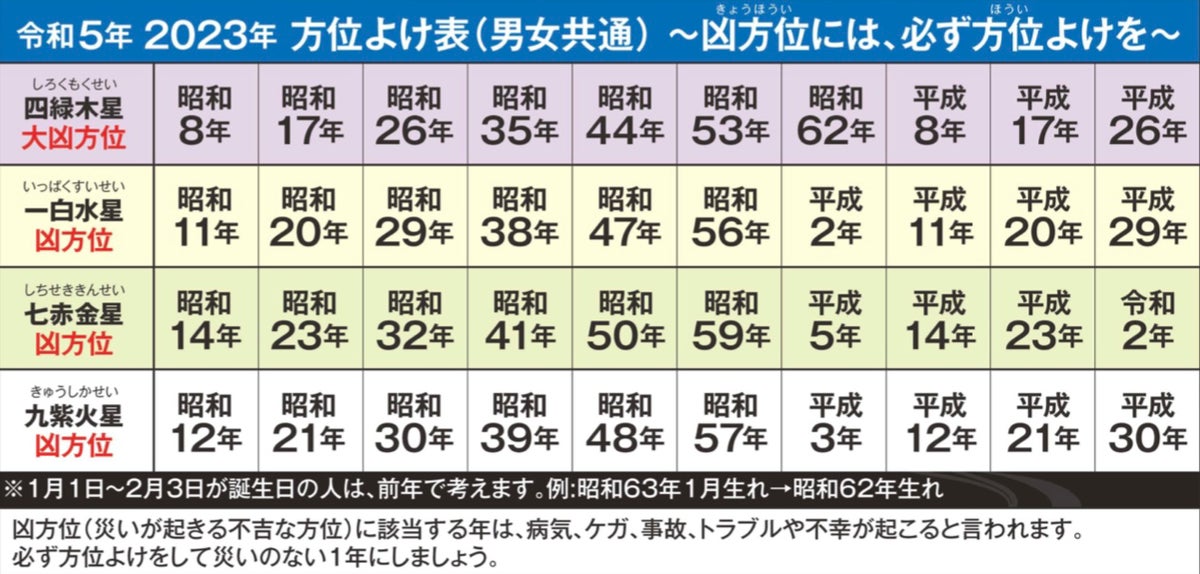 凶方位(災いが起きる不吉な方位)に該当する年には、病気、ケガ、事故、トラブル、不幸が起きると言われます。その災いを避けるために行う祈願が「方位よけ祈願」です。厄年とは違い、男女の区別はありません。