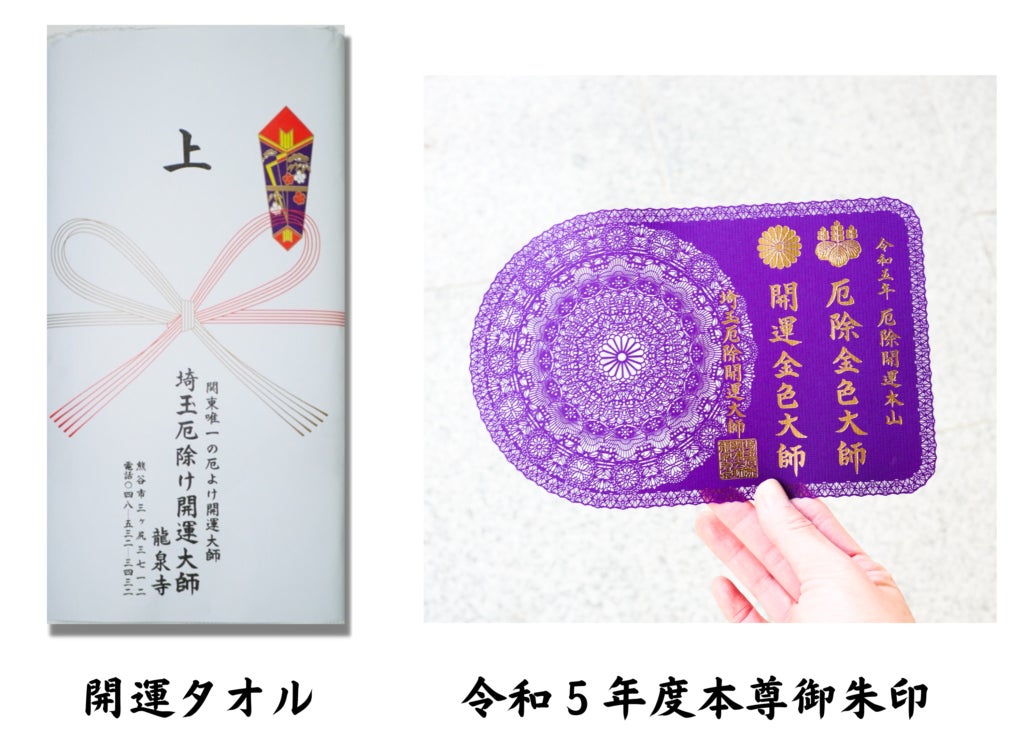 縁起物は開運タオルか本尊特別御朱印からお選びいただきます。