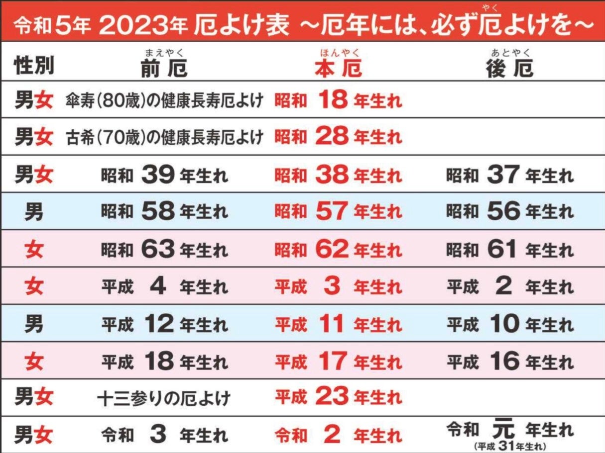 前厄・本厄・後厄の3年間は必ず厄除けをして厄から身を守りましょう。