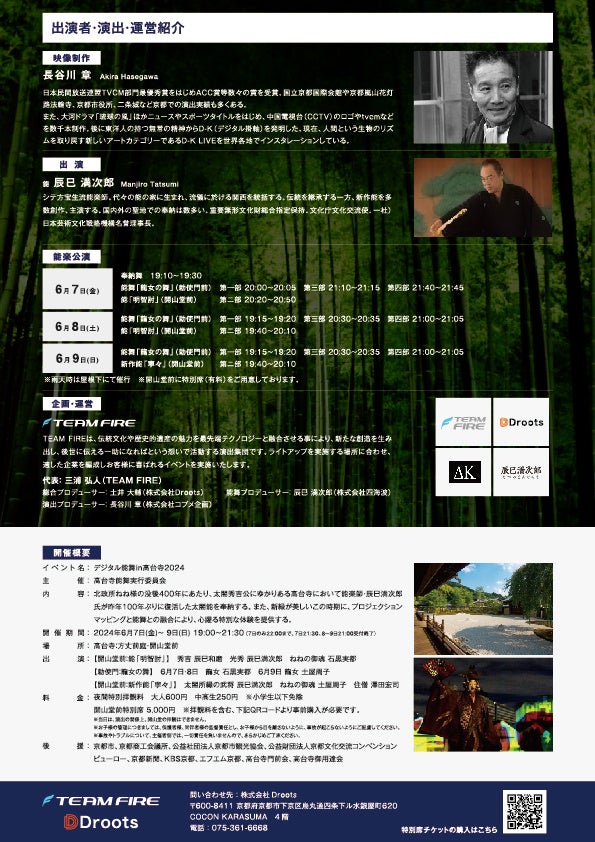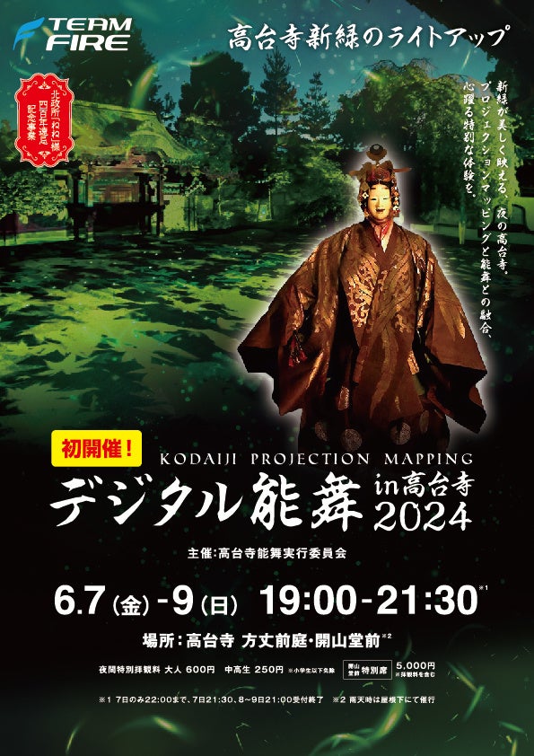 2023年11月に京都市役所本庁舎前広場で大好評を博した、日本を代表する舞台芸術である「能」とプロジェクションマッピングのコラボレーションイベント「京都デジタル能舞」。今回は、舞台を新緑が美しい高台寺に移し、「TEAM FIRE」が再び京都に帰ってきます。
