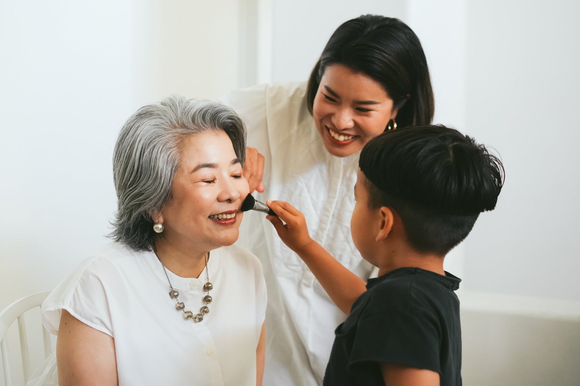 撮影を晴れやかな気持ちで迎えてほしいという思いを込めて、おじいちゃんおばあちゃんに向けたヘアメイクをご用意しました。おじいちゃんのヘアセット、おばあちゃんのポイントメイクのどちらか1名分をお選びください。お孫さんにはヘアブラシやチークブラシを使って、ヘアメイクの仕上げをお手伝いしていただきます。