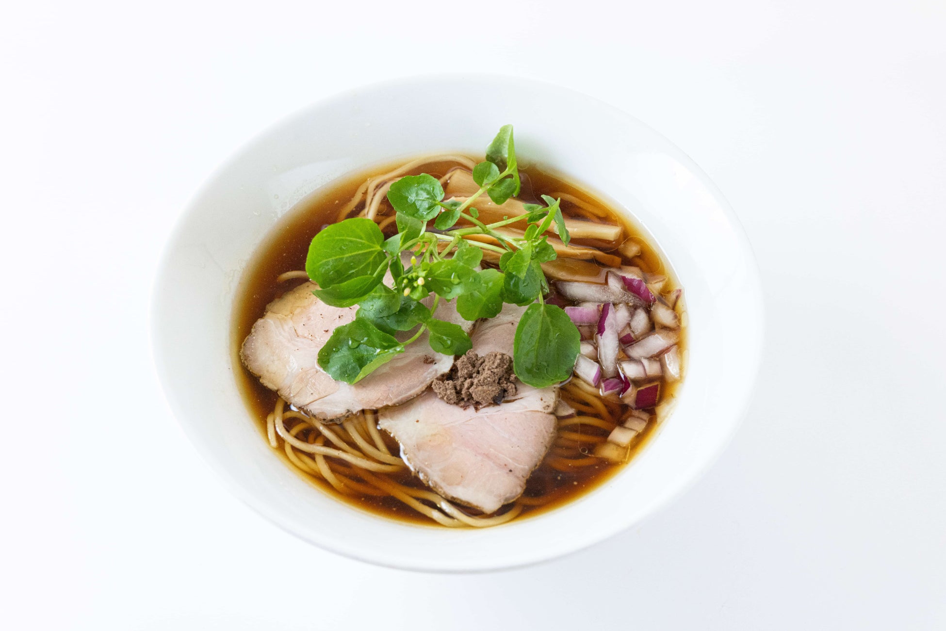 鶏清湯スープと宍道湖で捕れるしじみを丁寧に引きWスープで合わせ、そこにイタリア産の黒トリュフパウダーを。食べ進めるとトリュフ、鶏、醤油などの様々な香りが、後半スープの温度が落ちてきた時からしじみの香りがより前に出てきます。
