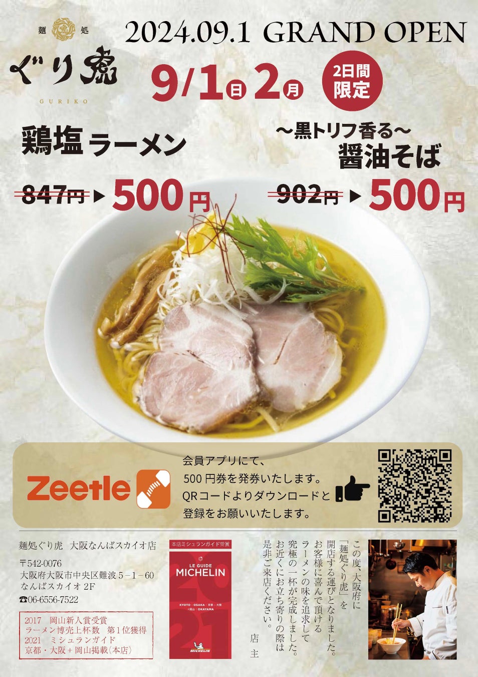 「麺処ぐり虎 大阪なんばスカイオ店」がグランドオープン!感謝記念として9/1(日)、9/2(月)の2日間限定、人気メニュー「鶏塩ラーメン」「黒トリュフ香る醤油そば」を【1杯500円】でご提供!!