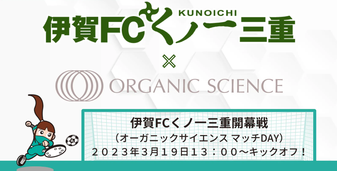 日本女子サッカーリーグ(通称:なでしこリーグ)にて2021年度リーグ優勝、2022年度リーグ準優勝に輝いた強豪チーム「伊賀FCくノ一三重」の公式チームサプライヤーであるオーガニックサイエンス株式会社は、2023年3月19日(日)に開幕する伊賀FCくノ一三重開幕戦において、「オーガニックサイエンス・マッチデー」としてサポートすることが決定しました!