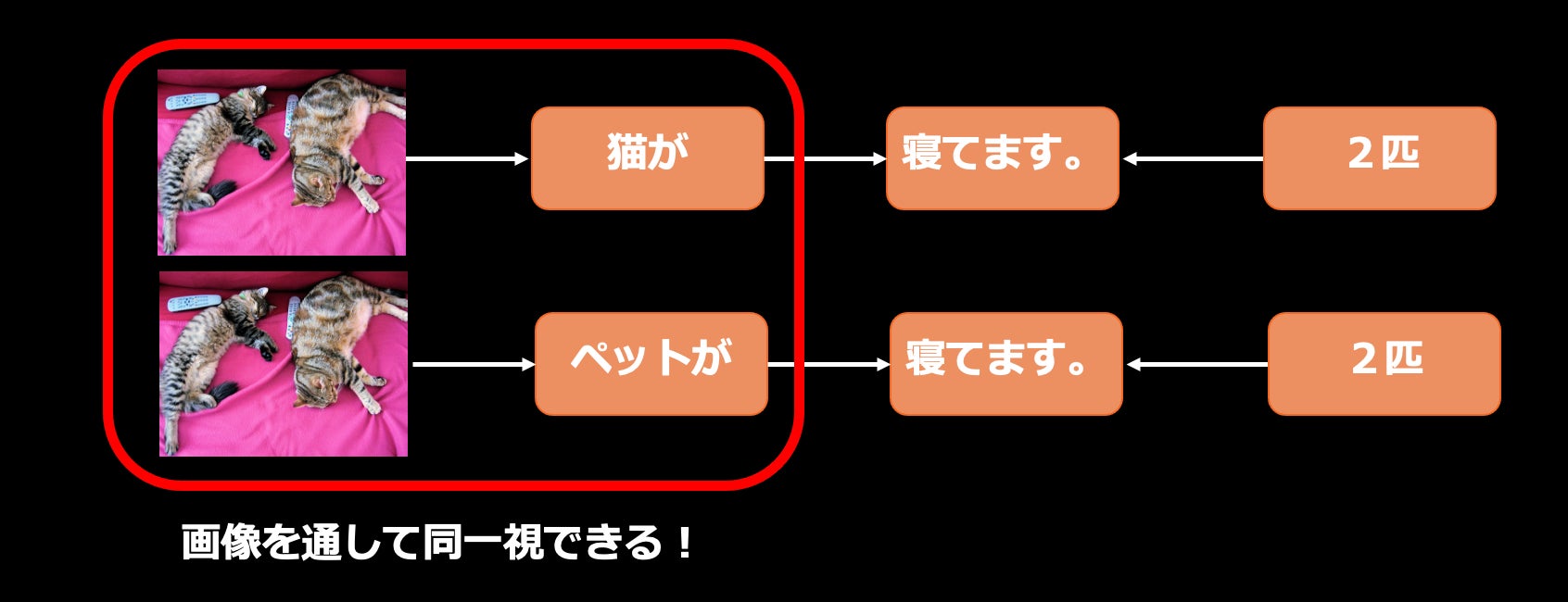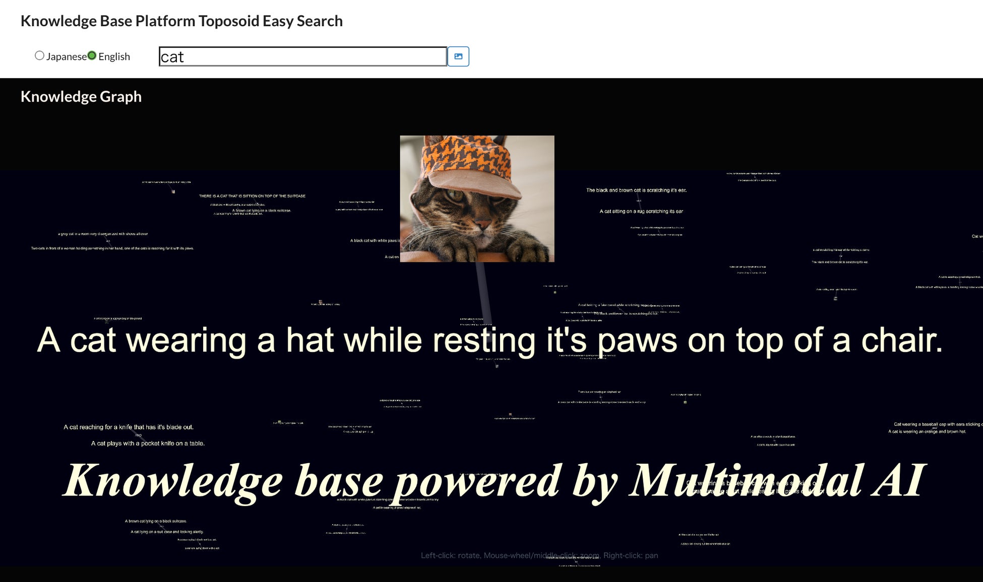この場合、画像からペットが猫であること、そしてその猫がほぼ同じ画像であることからこの二つの文章を同一視することができます。今回「Toposoid」は、画像とテキストの両方をナレッジベース上で扱える機能拡張を行い、文章の曖昧性を画像で補うことでより高度なマッチングを実現しました。