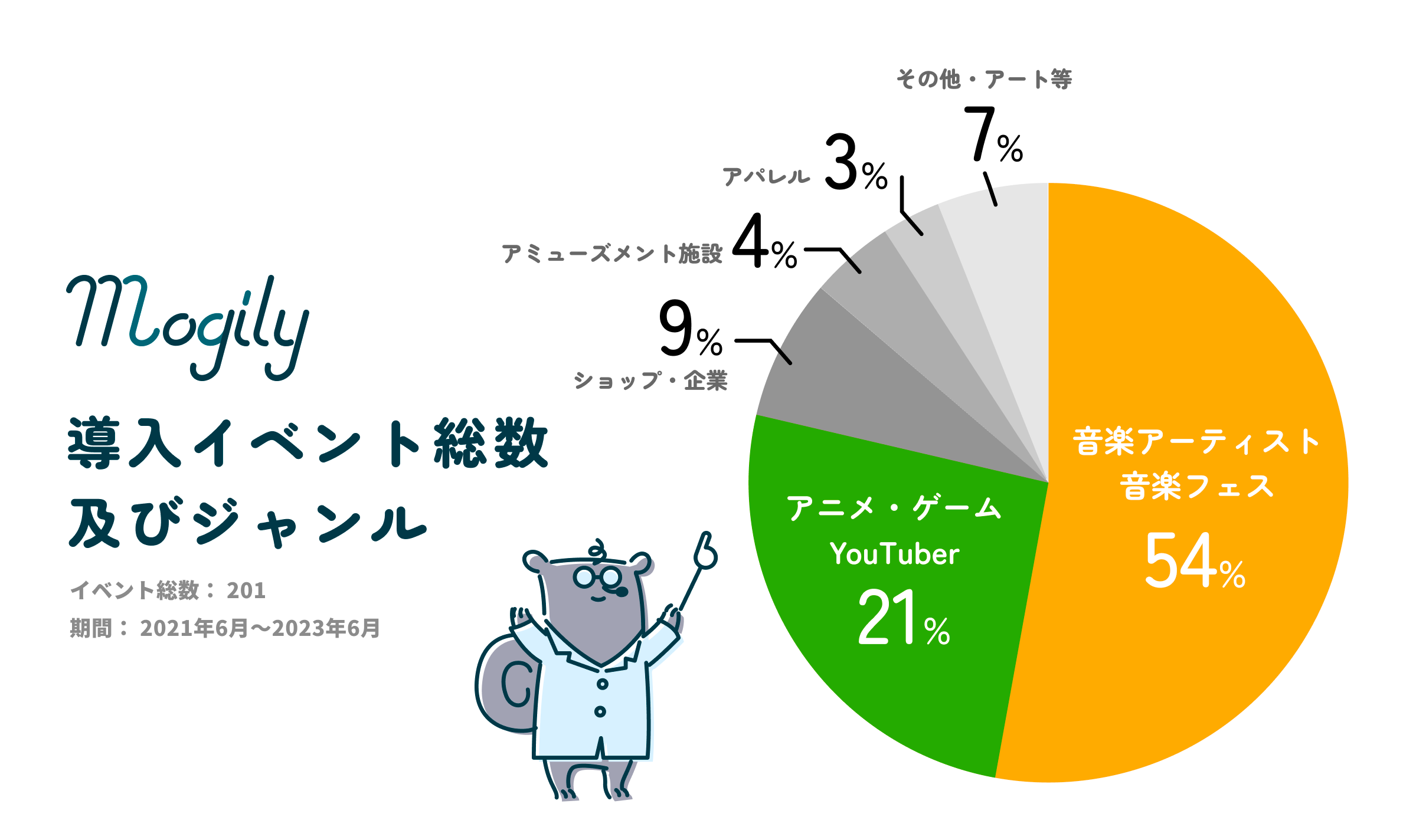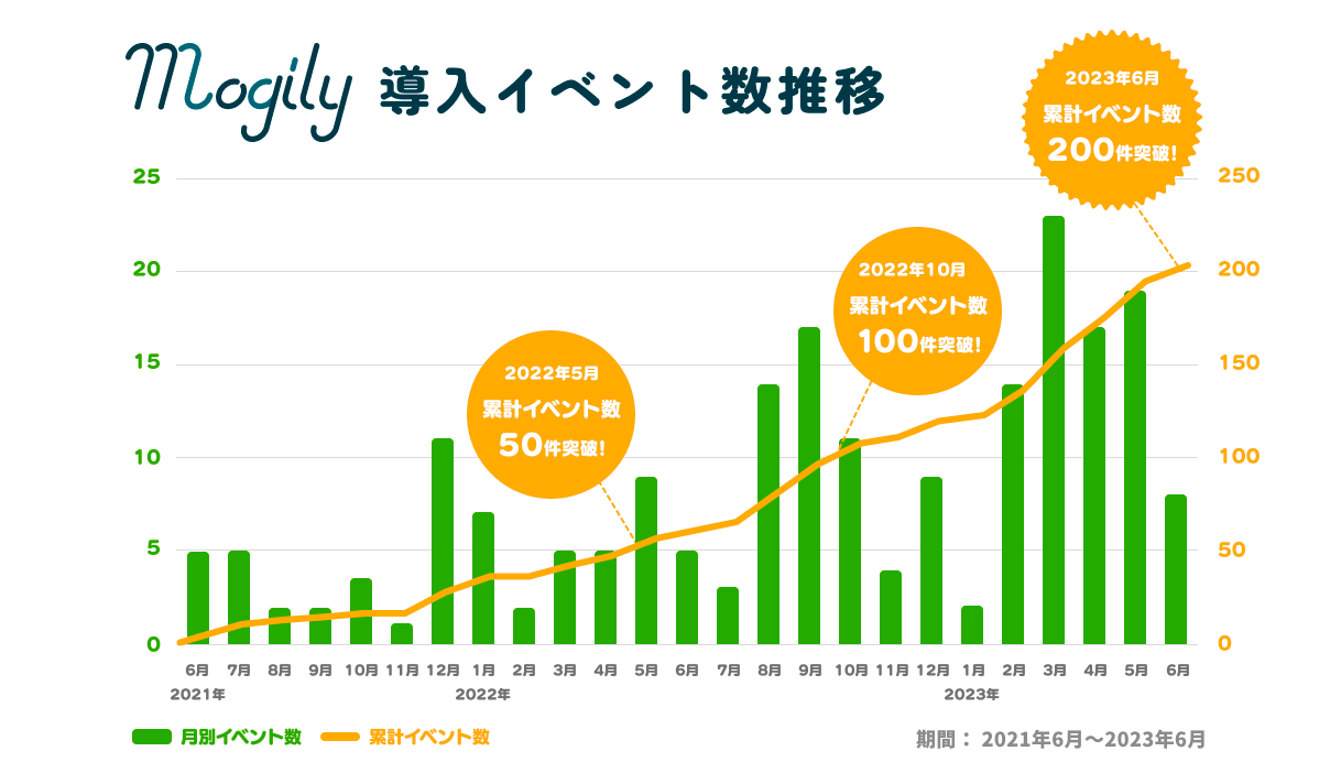 2021年6月から2年間で合計201件のイベントにて『mogily』をご利用いただきました。現在はアーティストの音楽ライブや音楽フェスでのご利用が全体の54%と半数を占めています。2022年からは音楽系のイベントだけでなく、アニメやゲーム系コンテンツ、YouTuberのイベントが増加しており21%に、ポップアップショップや店舗イベントなど、ショップ・企業(店舗)が9%と続いています。直近では機能追加を含むアップデートにてより利便性が向上しており、アパレル系やアミューズメント施設での使用など、幅広いジャンルのイベントにもご利用いただけるようになりました。特に2023年2月以降は導入いただくイベント数が増加傾向にあり、2023年6月に導入イベント数の合計が200件を突破しました。