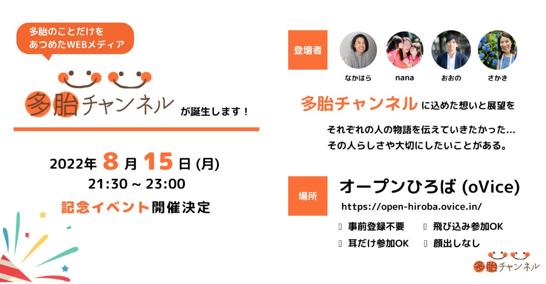多胎チャンネルに込めた想いと展望を代表理事中原、大野、nana、さかきがお話しします。バーチャル空間「oVice」< https://open-hiroba.ovice.in/ > にて実施いたします。事前登録不要、耳だけ参加も可能です。多胎育児をされていない方でも、お気軽にご参加ください。