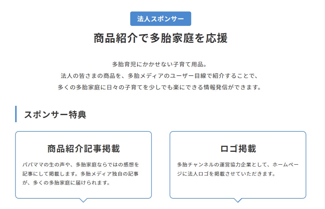 商品紹介で多胎家庭を応援いただく「法人スポンサー」を募集しています。詳しくは < https://tatai-ch.jp/corporate > をご覧ください。