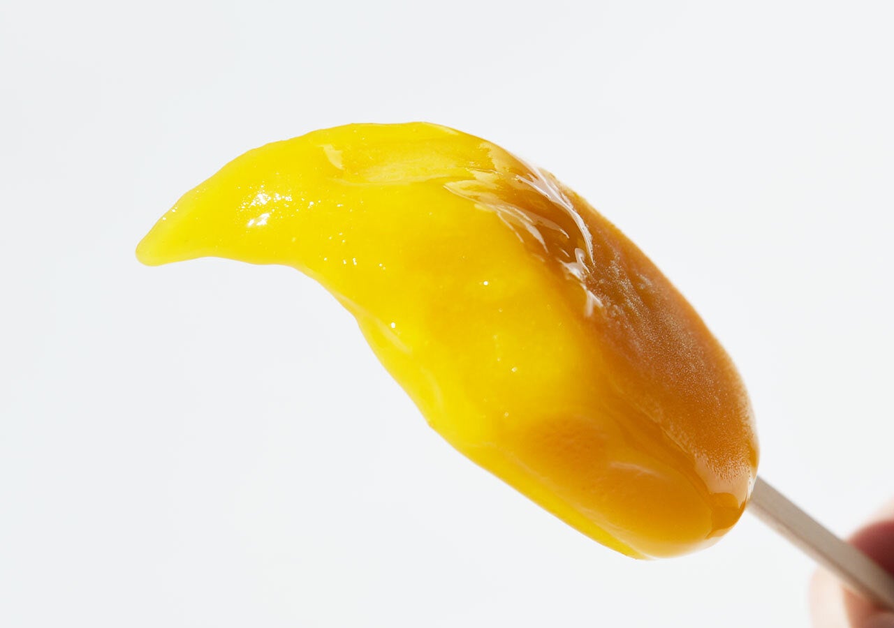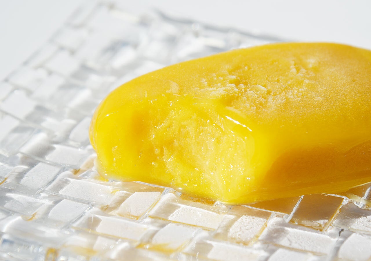 アルフォンソマンゴーの生の風味をそのまま閉じ込めるため、産地であるインドで完熟したものだけをピューレ加工しています。使用したピューレには、アルフォンソマンゴーを100%使用しています。果汁ではなく、ピューレ(果汁・果肉)を使うことにこだわり、より果肉感を感じることができるアイスバーとなりました。