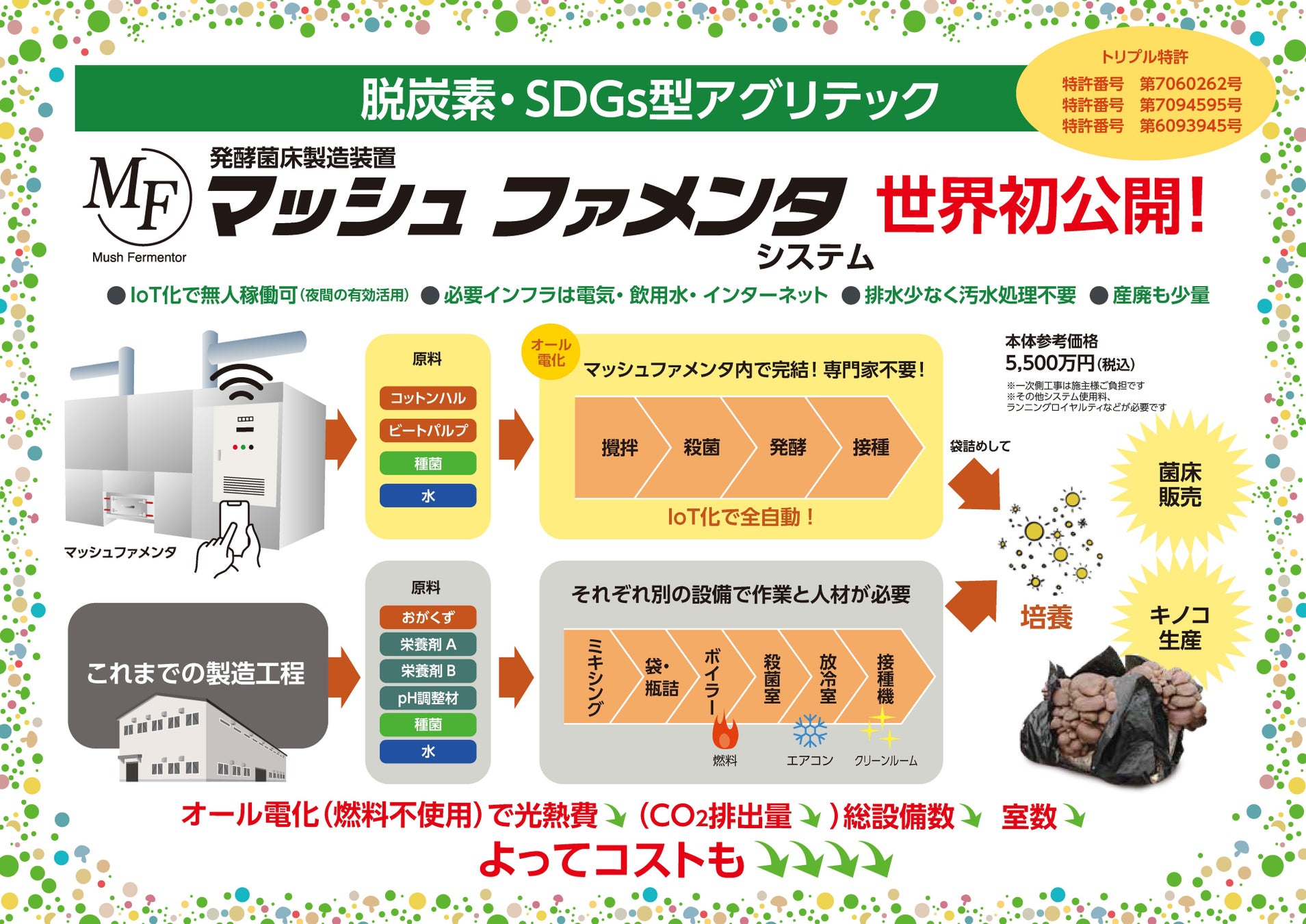 既存技術との大きな違いとしては、大きなエネルギーを使用しなければならない「滅菌」をせず、「殺菌」と「発酵」を行うこと。残存した「微生物」と「キノコ菌」の相互作用により「栄養剤」「添加物」を必要としないことが挙げられます。また「増収剤」を使用していないにも関わらず、単位面積当たり収穫量は既存技術とそん色がありません。