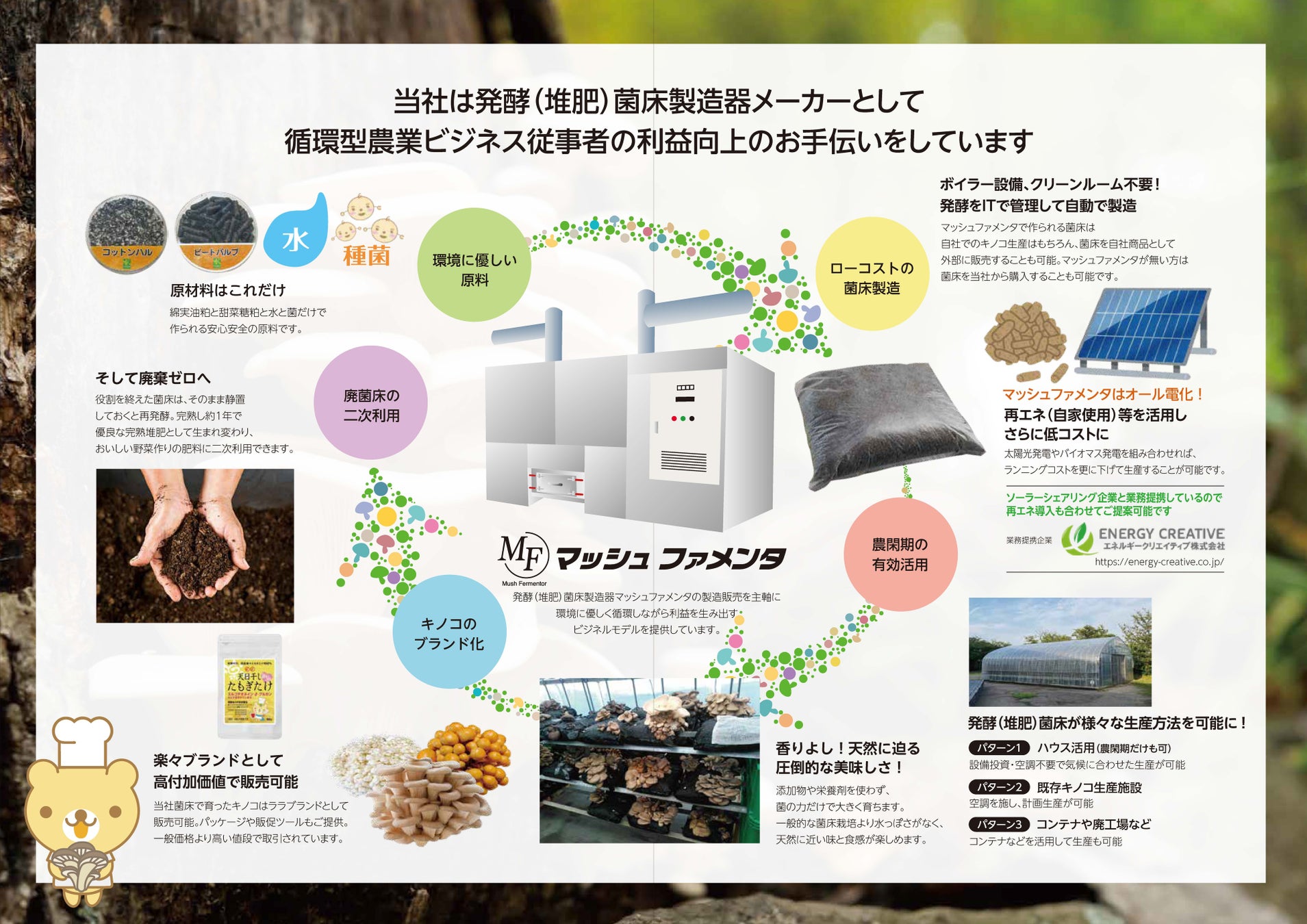 株式会社楽々の開発したマッシュファメンタシステムでは、IOT化により無人で精密な原料の加工を行い、原料由来(自然界に常在する)微生物のメカニズムを活用したキノコ菌床製造を行っています。