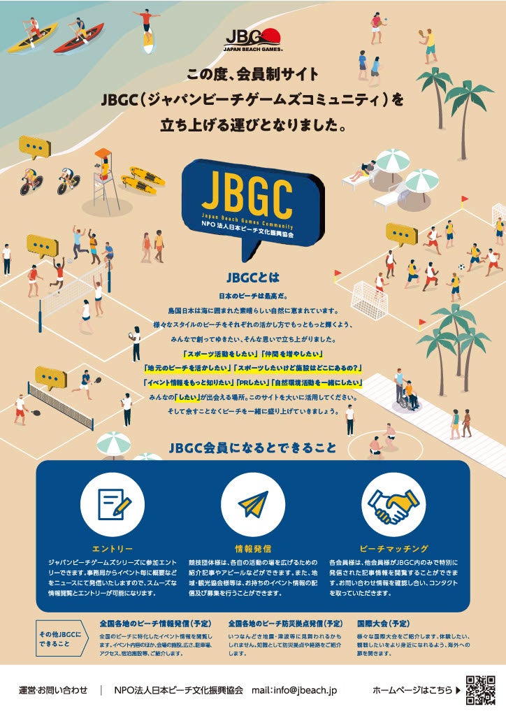 NPO法人日本ビーチ文化振興協会(東京都中央区 代表理事:佐伯美香)は、この度、日本のビーチ(海辺・周辺地域)に関するポータルサイト「ジャパンビーチゲームズコミュニティ」を開設します。