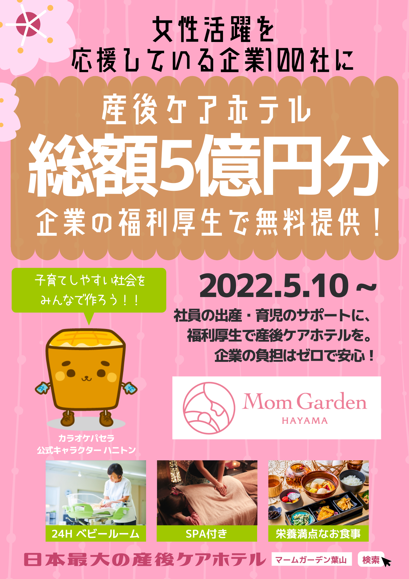 株式会社マムズ(本社:東京都新宿区、取締役社長:斎藤睦美)は、日本最大の産後ケアホテル マームガーデン葉山(神奈川県 横須賀市)を2021年12月にOPEN。今回、女性社員の活躍や男性の育児参加を応援している企業の従業員様に100社に100泊ずつ、計1万泊・総額5億円分を企業の福利厚生としてプレゼントいたします。