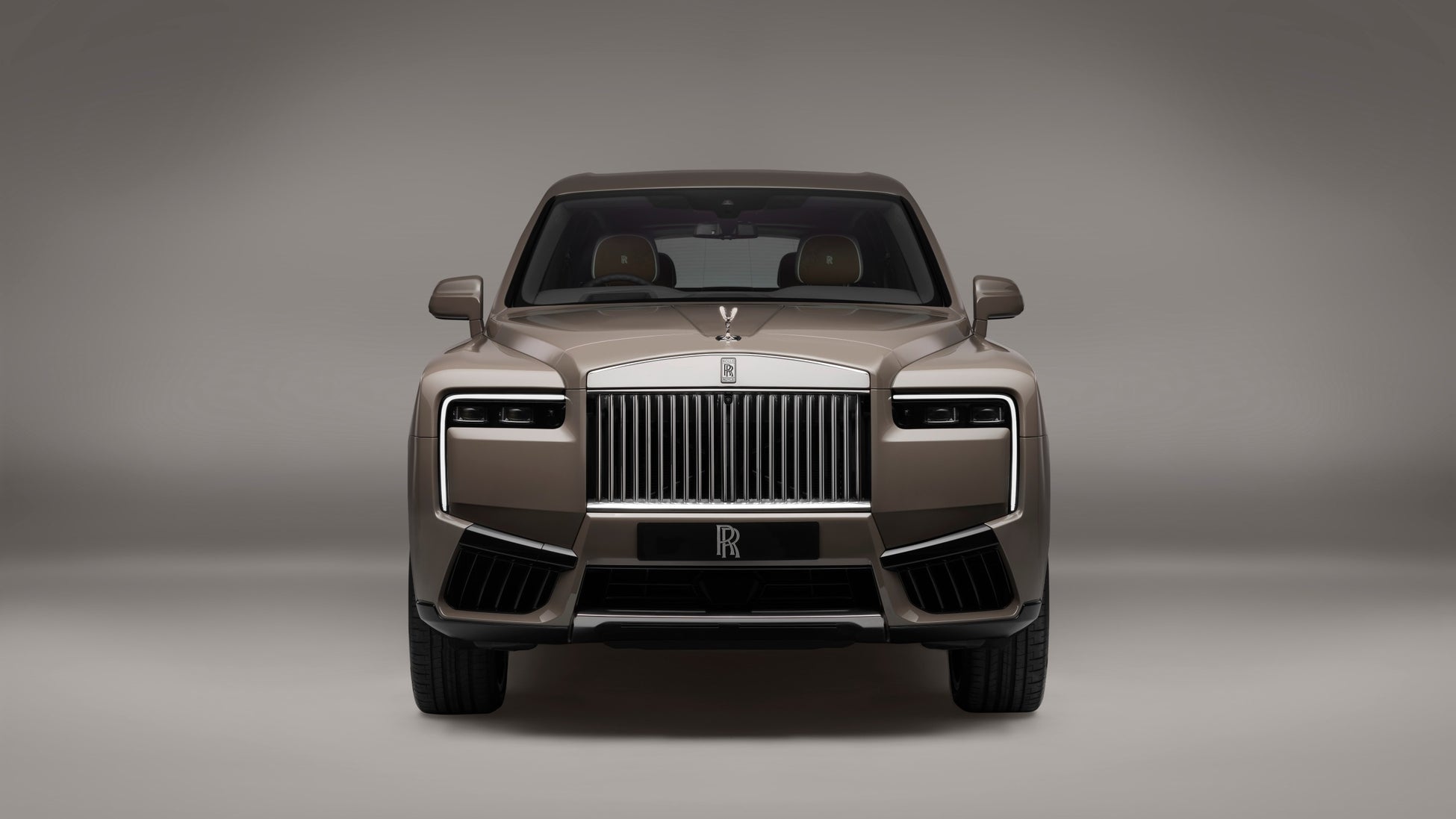 カリナン・シリーズ IIのフロントは、シンプルで特徴あるラインと鮮明なエッジから成り、クリーンでモノリシックな表面が際立つことにより、この車のゆったりとしたプロポーションと存在感を増幅させています。バンパー・ラインは、デイタイム・ランニング・ライトの最下点からクルマの中心に向かって浅い「V」を描き、現代のスポーツ・ヨットの船首にみられる鋭いラインを彷彿とさせます。その下には、新型のエアインテークが外向きに角度をつけながらはっきりと主張し、正面から見たときに車高を視覚的に下げる効果を果たしています。