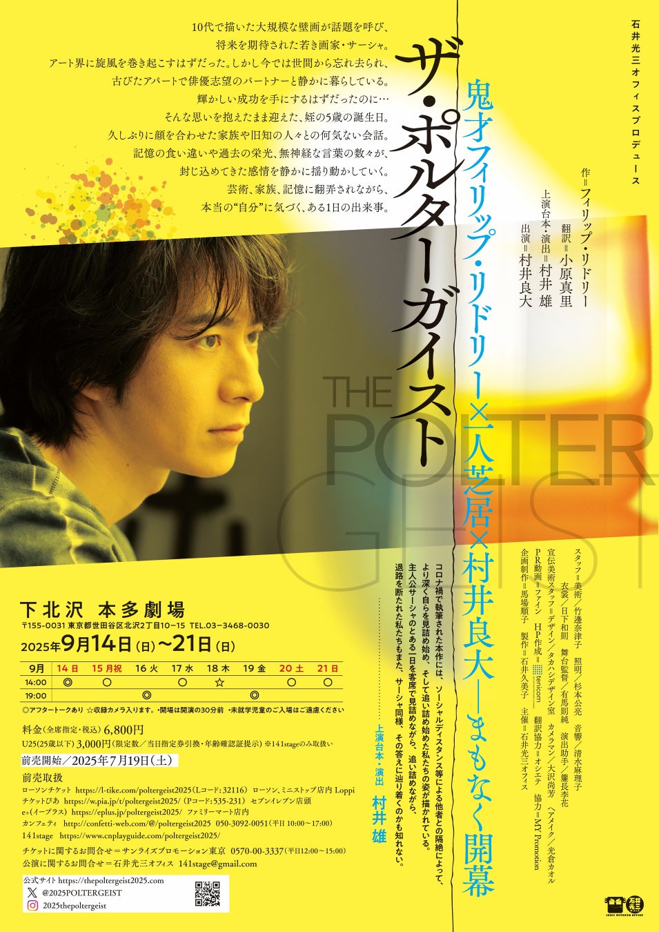 この仕事を始めてもうすぐ20年。『ザ・ポルターガイスト』という初めての一人芝居は、まさに“自分の芝居の総決算”のような感覚です。僕は一人芝居の元祖は落語だと思っているんですが、そういうものも勉強しながら、今回、演出の村井雄さんと一緒にしっかりとした一人芝居を作れることがすごく嬉しいです! 10人以上のキャラクターが登場する中、メインで演じるサーシャは天才肌であるが故に少しねじまがってしまっている状態…なのかな? まだまだ解読中ですが、演出の村井さんは一人芝居を作るのに慣れてらっしゃるので頼もしいですし、パフォーミングアーツ的な作り方をされているところもすごく勉強になっています。「いろんな役を演じるけど、全部村井良大でもいいよ」の言葉を信じ、本当に“一瞬の体験”のような…ある意味、想像力のテーマパークのような、そんなフレッシュな感覚で楽しめる作品にできたらいいですね。新しい世界、まさに自分との戦いです。