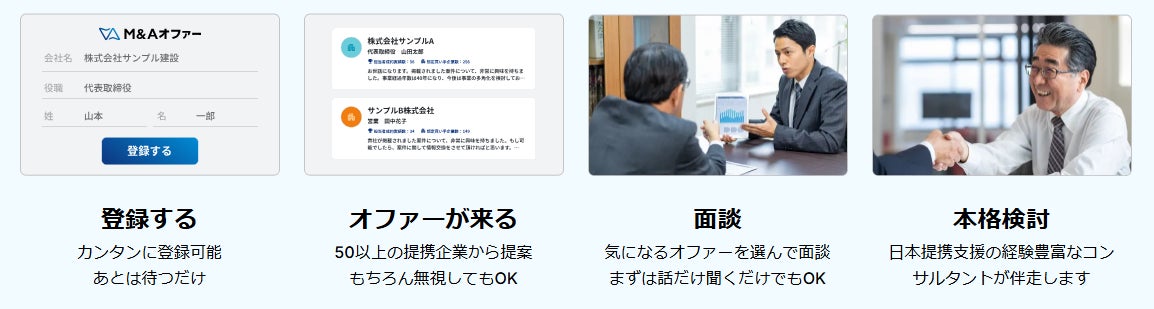 M&A オファーは事業承継の中での第三者承継や成長戦略での売却を検討している経営者向けに、厳選された50社超の提携M&A支援会社から、希望条件に応じた最適なオファーを受け取れるプラットフォームです。