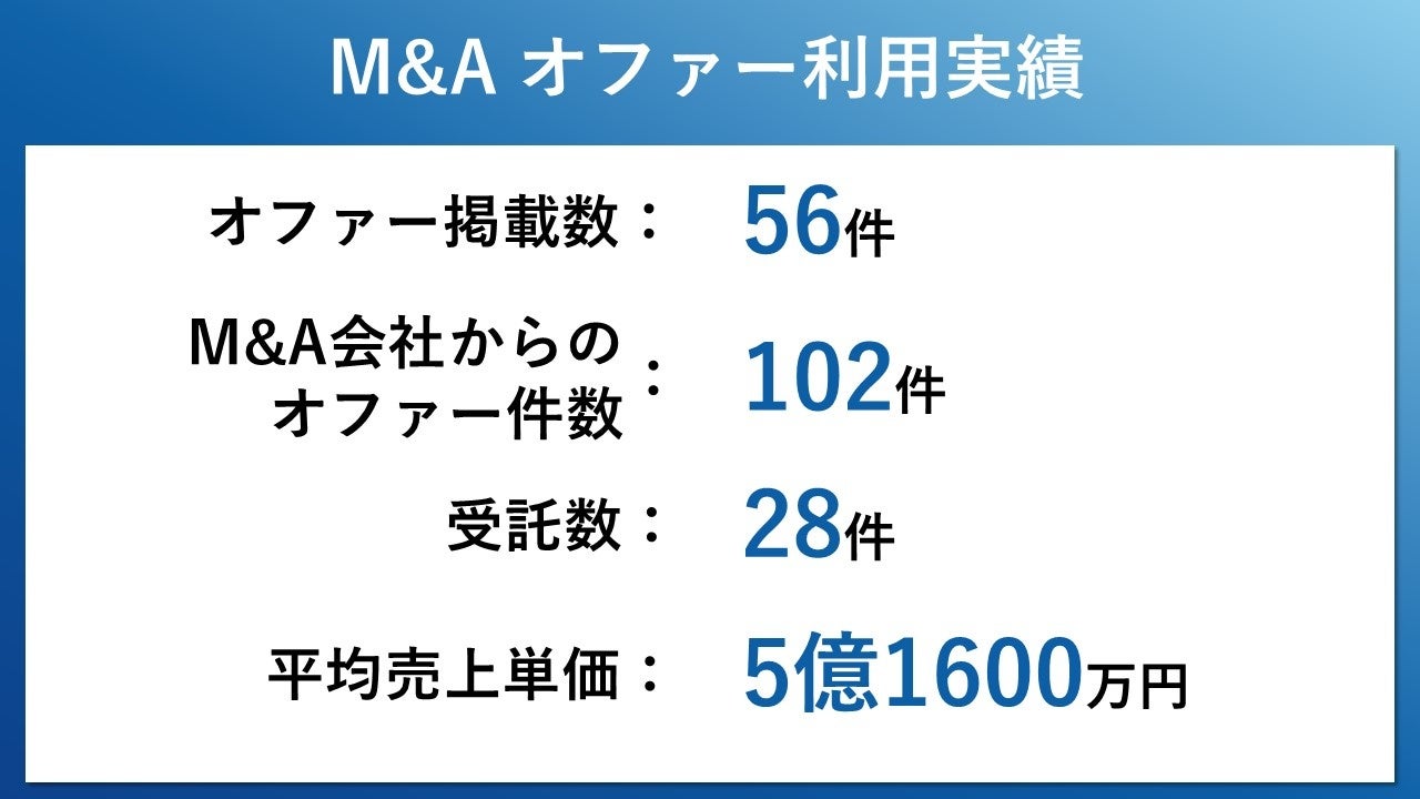 日本提携支援ではトライアル版のM&A オファーを2024年の1年間ですでにリリースしており、オファーから納得のいくM&A支援会社にアドバイザリー契約を締結された数(受託数)は28件、売上単価(成約金額)は5億1600万円にのぼり、成約事例も出てきております。