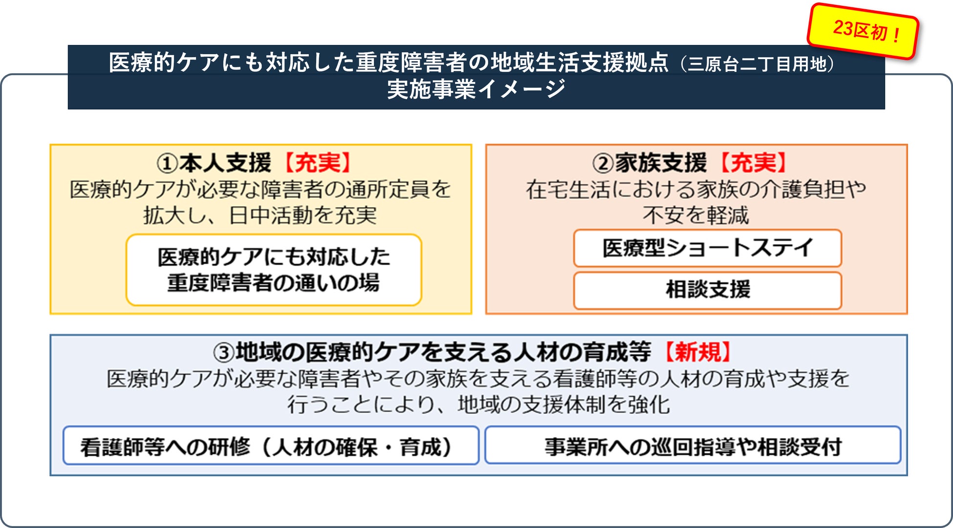 新たな施設は、重度障害者の通いの場の提供、医療型ショートステイ、地域の医療的ケアを支える人材の育成等を実施し、医療的ケアが必要な障害者やその家族などの地域生活を支える拠点となる。障害者本人やその家族に加え、支援者を支える機能を持つ施設の整備は、23区初の試み。