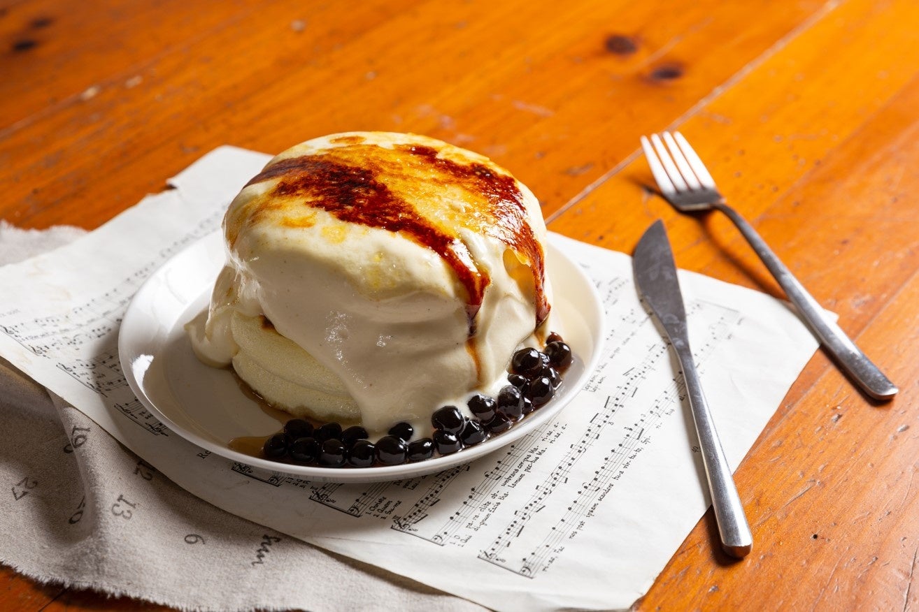 ソウルで人気メニューのパールクリームブリュレスフレ(とろけるパンケーキの横には甘さ控えめの黒糖タピオカパールが添えてあり、様々な触感を体感できる黄金の組合せ!)