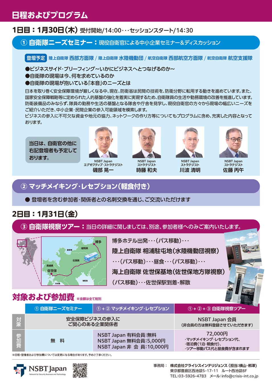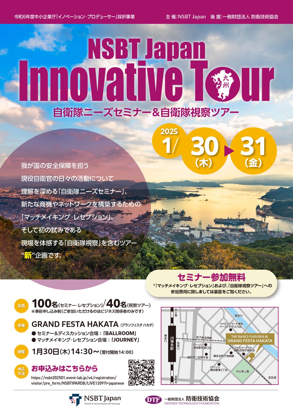 株式会社クライシスインテリジェンス(本社:東京都豊島区、代表 : 浅利 眞)が運営する安全保障ビジネスの情報サイト「NSBT Japan」は、令和6年度中小企業庁の「イノベーション・プロデューサー」採択事業の一環として、2025年1月30日(木)と31日(金)に、安全保障ビジネスへの新規参入をご検討中の企業を対象とした、「NSBT Japan Innovative Tour」を九州にて開催いたします。