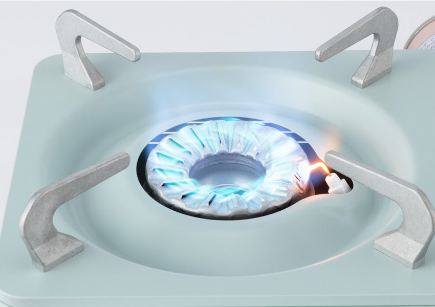 点火時に炎が渦巻き状に燃焼するトルネードバーナー(内炎式)を採用しており、同スペックのカセットコンロに比べて、火力が高く、熱損失が少ないためガス消費量が削減できます。