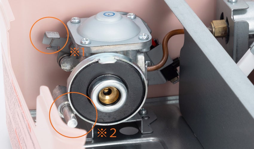 「圧力感知安全装置(図※1)」と「容器装着安全装置(図※2)」の2つの安全装置が付いており、ボンベ装着時の誤使用のリスクを抑えます。