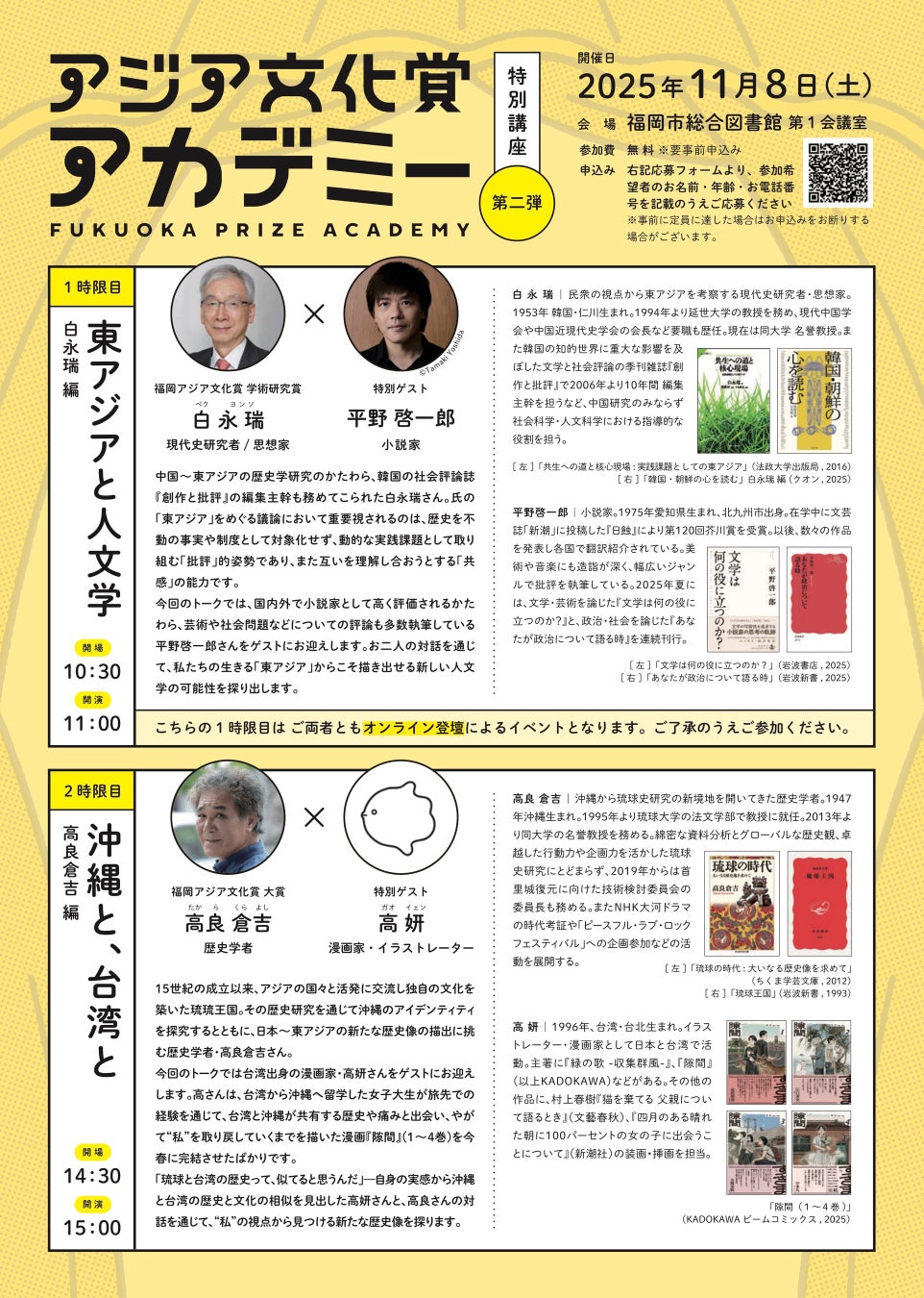 11月8日(土)に福岡市総合図書館で開催される今回の講座では、2025年に大賞を受賞した高良倉吉さんと、学術研究賞を受賞した白永瑞(ペク・ヨンソ)さんが、それぞれ特別ゲストとの対談を行います。特別ゲストとしてお迎えするのはそれぞれ、小説家の平野啓一郎さんと漫画家の高妍(ガオ・イェン)さんのお二人です。参加は無料。ぜひご参加ください。