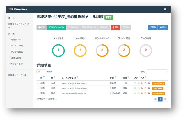 導入が進んでいるのは、地域金融機関(銀行や信用金庫)では、重要情報を多数保持しており、社会的な信用が非常に求められ、サイバー攻撃にあった場合の影響は甚大です。そのため、標的型攻撃メールに対する対策と日頃からの訓練により職員のレベルアップは急務であり、「KIS Mailmon」の導入によって、実践的な訓練を通じリスクを軽減する取り組みが進んでいます。