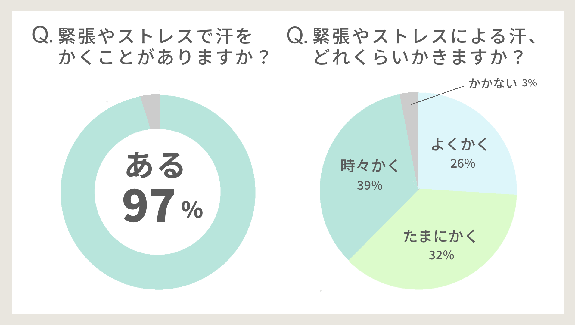 20~40代女性に「職場での緊張やストレス、育児、日常生活の緊張やストレスで汗をかくことがありますか?」とアンケートでお尋ねしたところ、97%の女性が「ある」と回答しました。