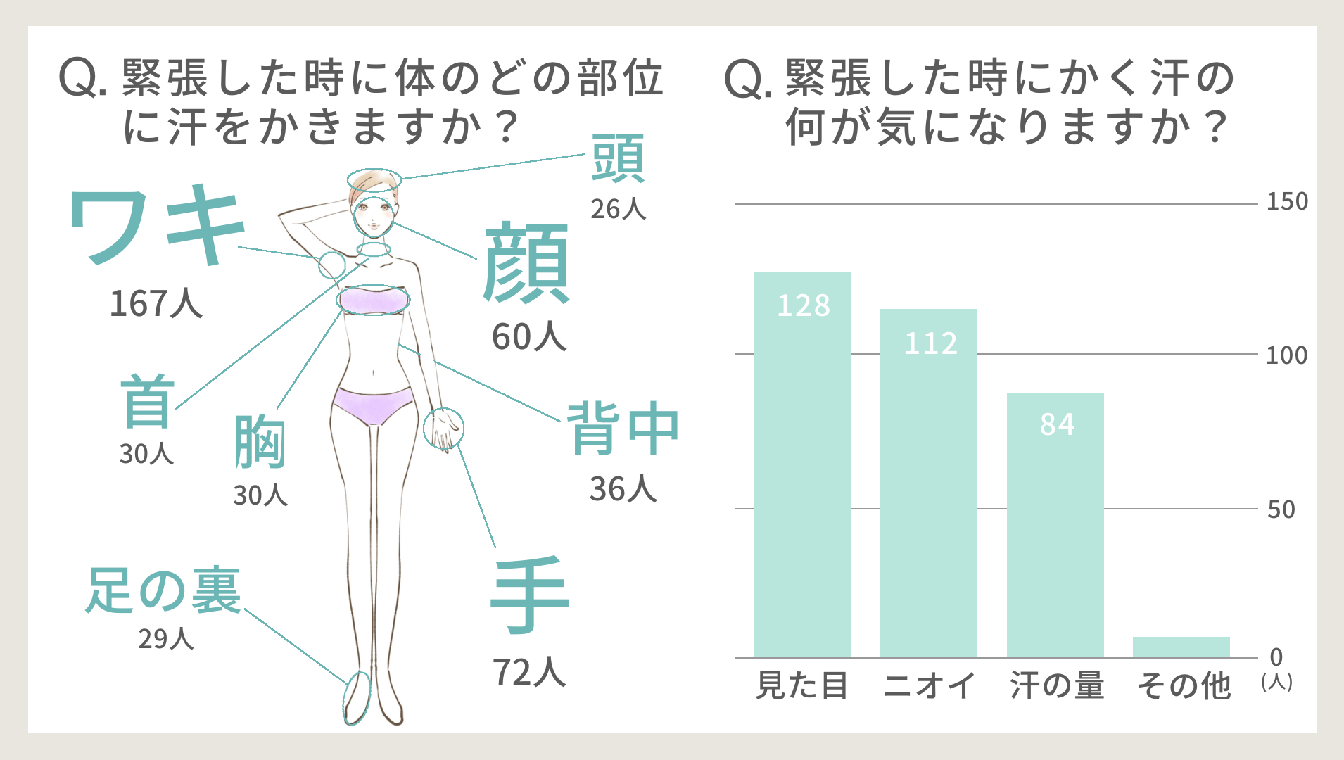 また、その「緊張した時にかく汗の、何が気になりますか?(※複数選択可))」とお尋ねしたところ、「見た目」128人、「ニオイ」112人、「汗の量」84人、「その他」4人という結果に。