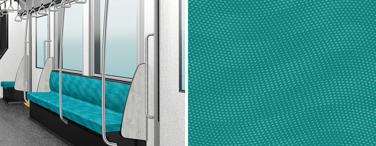 ・福井鉄道沿線の水の張られた水田や日野川など、豊かな水資源をモチーフとして、水の流れを感じさせる色柄を採用した爽やかなシートデザイン