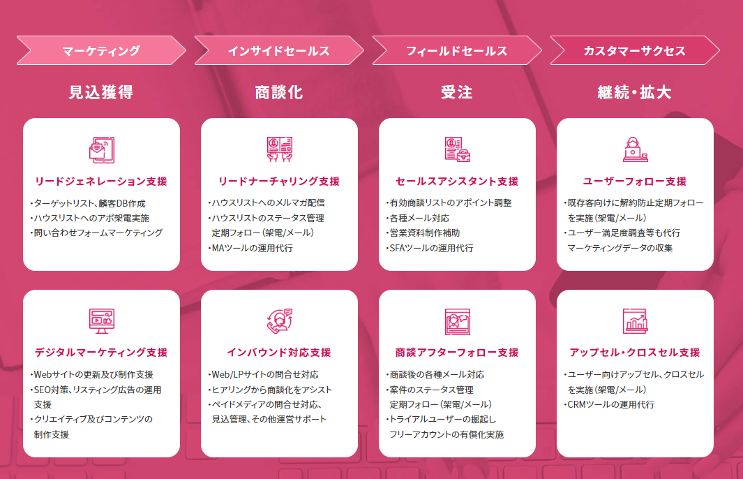 従来のマーケティング/インサイドセールス支援に加え、フィールドセールス/カスタマーサクセス支援を拡充し、BtoB営業/マーケティング部門のリソース不足解消に幅広くお応えいたします。
